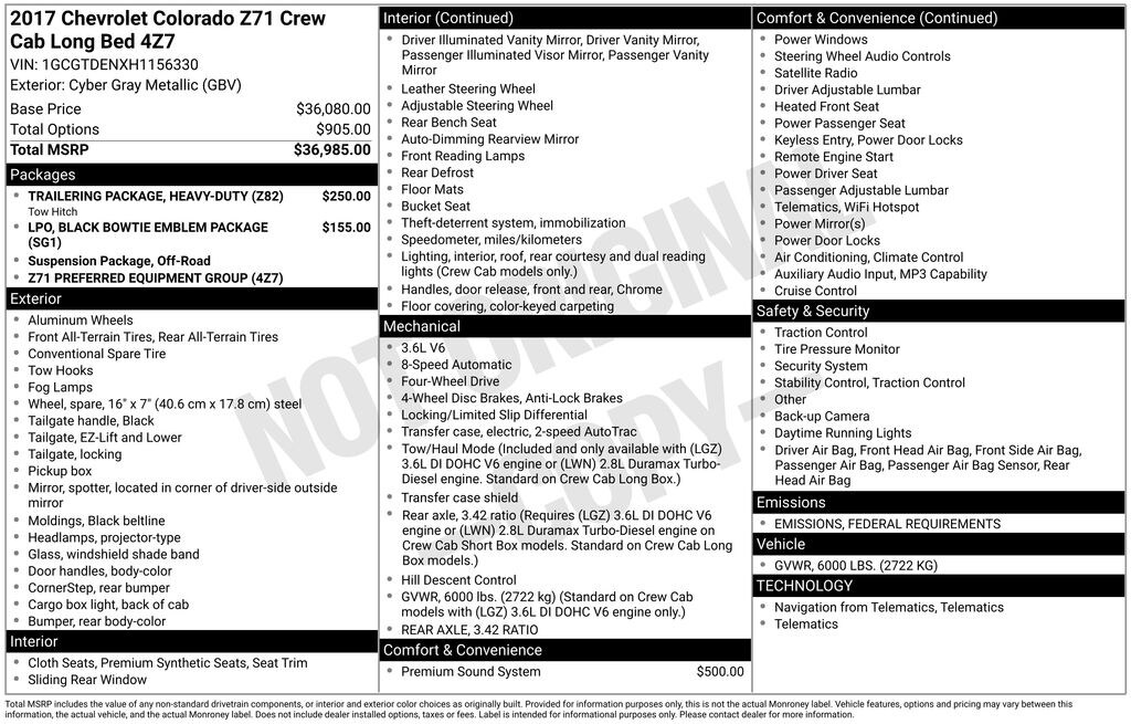 Gregg Young Ford is proud to offer this good-looking 2017 Chevrolet Colorado Z71 in Cyber Gray Metallic, 4WD, 3.42 Rear Axle Ratio, 4-Way Power Front Passenger Seat Adjuster, 4-Wheel Disc Brakes, 6 Speakers, 6-Speaker Audio System Feature, ABS brakes, Air Conditioning, Alloy wheels, AM/FM radio: SiriusXM, Apple CarPlay, Auto-dimming Rear-View mirror, Automatic temperature control, Black Bowtie Emblem Package (LPO), Bose Premium 7-Speaker Audio System Feature, Bumpers: body-color, Cloth/Leatherette Seat Trim, Compass, Delay-off headlights, Driver 4-Way Power Seat Adjuster, Driver door bin, Driver vanity mirror, Dual front impact airbags, Dual front side impact airbags, Electronic Stability Control, Emergency communication system: OnStar Guidance, Exterior Parking Camera Rear, Front anti-roll bar, Front Bucket Seats, Front Center Armrest, Front fog lights, Front reading lights, Front wheel independent suspension, Fully automatic headlights, Heated Driver & Front Passenger Seats, Heated front seats, Heavy-Duty Trailering Package, Illuminated entry, Low tire pressure warning, Occupant sensing airbag, Outside temperature display, Overhead airbag, Overhead console, Panic alarm, Passenger door bin, Passenger vanity mirror, Power door mirrors, Power Driver Lumbar Control Seat Adjuster, Power driver seat, Power Passenger Lumbar Control Seat Adjuster, Power passenger seat, Power steering, Power windows, Preferred Equipment Group 4Z7, Premium audio system: Chevrolet MyLink, Radio data system, Radio: AM/FM Stereo w/8" Diagonal Color Touch Screen, Rear reading lights, Rear seat center armrest, Rear step bumper, Rear window defroster, Remote keyless entry, Security system, SiriusXM Satellite Radio, Speed control, Speed-sensing steering, Steering wheel mounted audio controls, Tachometer, Telescoping steering wheel, Tilt steering wheel, Traction control, Trip computer, Variably intermittent wipers, Wheels: 17" x 8" Dark Argent Metallic Cast Alloy.