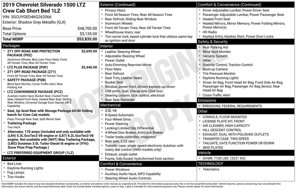 Gregg Young CDJR is pumped up to offer this superb-looking 2019 Chevrolet Silverado 1500 LTZ in Shadow Gray Metallic, CLEAN CARFAX, 10-Way Power Driver Seat w/Lumbar, 10-Way Power Passenger Seat Adjuster w/Lumbar, 12-Volt Rear Auxiliary Power Outlet, 120-Volt Instrument Panel Power Outlet, 170 Amp Alternator, 2 USB Ports (First Row), 2nd Row Heated Outboard Seats, 4.2" Diagonal Color Display Driver Info Center, 6-Speaker Audio System, Advanced Trailering System, All-Weather Floor Liner (LPO) (AAK), Apple CarPlay/Android Auto, Auto-Dimming Inside Rear-View Mirror, Auxiliary External Transmission Oil Cooler, Bluetooth® For Phone, Chevytec Spray-On Black Bedliner, Chrome Grille, Chrome Mirror Caps, Color-Keyed Carpeting Floor Covering, Compass, Deep-Tinted Glass, Driver Memory, Electric Rear-Window Defogger, Electrical Lock Control Steering Column, Electronic Cruise Control, EZ Lift Power Lock & Release Tailgate, Floor Mounted Console, Front Bucket Seats, Front Frame-Mounted Black Recovery Hooks, Front LED Fog Lamps, Front Rubberized Vinyl Floor Mats, HD Radio, HD Rear Vision Camera, Heated Driver & Front Passenger Seats, Heated Steering Wheel, Heated steering wheel, Heavy-Duty Rear Locking Differential, Hill Descent Control, Hitch Guidance, Hitch Guidance w/Hitch View, Illuminated entry, Integrated Trailer Brake Controller, Keyless Open & Start, Leather Wrapped Steering Wheel, LED Cargo Area Lighting, LTZ Convenience Package, LTZ Plus Package, Manual Tilt/Telescoping Steering Column, Off-Road Suspension, OnStar & Chevrolet Connected Services Capable, Outside Heated Power-Adjustable Mirrors, Power Door Locks, Power Front Passenger Windows w/Express Up/Down, Power Front Windows w/Driver Express Up/Down, Power Rear Windows w/Express Down, Power Sliding Rear Window w/Rear Defogger, Power Tailgate, Preferred Equipment Group 1LZ, Rear Dual USB Charging-Only Ports, Rear Rubberized-Vinyl Floor Mats, Rear Wheelhouse Liners, Remote keyless entry, Remote Vehicle Starter System, Safety Package, SiriusXM Radio, Steering Wheel Audio Controls, Theft Deterrent System (Unauthorized Entry), Trailer Tire Pressure Monitor System, Trailering Package, Universal Home Remote, Up-Level Rear Seat w/Storage Package, Ventilated Driver & Front Passenger Seats, Z71 Off-Road & Protection Package, Z71 Off-Road Package. EcoTec3 5.3L V8
