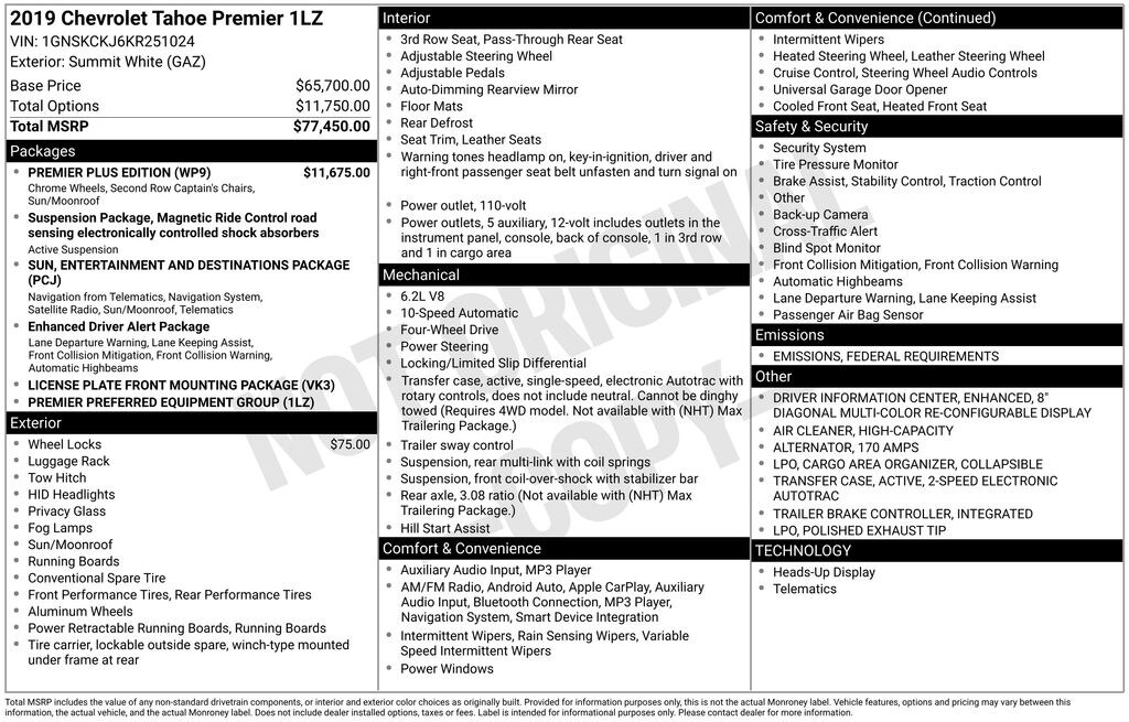Gregg Young CDJR is very proud to offer this outstanding 2019 Chevrolet Tahoe Premier in Summit White, CLEAN CARFAX, 170 Amp Alternator, 1st & 2nd Row Color-Keyed Carpeted Floor Mats, 3.23 Rear Axle Ratio, 3rd Row 60/40 Power Fold Split-Bench, 4-Wheel Antilock Disc Brakes w/Brake Assist, 5 12-Volt Auxiliary Power Outlets, Auto-Dimming Inside Rear-View Mirror, Black Assist Steps w/Chrome Accent Strip, Black Roof Rack Cross Rails, Bose Centerpoint Premium 10-Speaker Surround Sound, Cargo Net, Collapsible Cargo Area Organizer (LPO), Color-Keyed Carpeting Floor Covering, Driver Inboard & Front Passenger Airbags, Electronic Cruise Control w/Set & Resume Speed, Enhanced Driver Alert Package (Y86), Enhanced Driver Information Center, Exterior Parking Camera Rear, Floor Console, Fog Lamps, Forward Collision Alert, Front Passenger 6-Way Power Seat Adjuster, Hands Free Power Liftgate, Heated & Ventilated Driver & Front Passenger Seats, Heated 2nd Row Seats, Heated front seats, Heated Leather Wrapped Steering Wheel, Heated rear seats, Integrated Trailer Brake Controller, IntelliBeam Headlamps, Lane Change Alert w/Side Blind Zone Alert, Lane Keep Assist w/Lane Departure Warning, License Plate Front Mounting Package, Low Speed Forward Automatic Braking, Magnetic Ride Control Suspension Package, Memory Settings, Passive Entry System, Polished Exhaust Tip, Power Liftgate, Power Release 2nd Row Bucket Seats, Power Sunroof, Power Tilt & Telescopic Steering Column, Power-Adjustable Accelerator & Brake Pedals, Power-Folding Heated Outside Mirrors, Power-Retractable Assist Steps, Preferred Equipment Group 1LZ, Premier Plus Edition, Push Button Keyless Start, Rear Cross Traffic Alert, Remote Vehicle Start, Roof-Mounted Luggage Rack Side Rails, SiriusXM NavTraffic, SiriusXM Radio, Sun, Entertainment & Destinations Package, Universal Home Remote, Wireless Charging. EcoTec3 6.2L V8