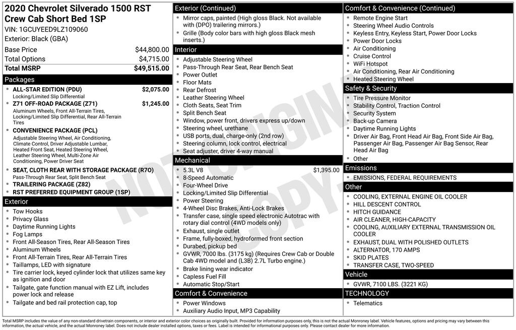 Gregg Young CDJR is proud to offer this gorgeous-looking 2020 Chevrolet Silverado 1500 RST in Black, TRADE IN, TONNEAU COVER, 12-Volt Rear Auxiliary Power Outlet, 2 USB Ports (First Row), 4-Way Manual Driver Seat Adjuster, 4.2" Diagonal Color Display Driver Info Center, 6-Speaker Audio System, All-Star Edition, Bluetooth® For Phone, Body Color Grille, Cloth Rear Seat w/Storage Package, Color-Keyed Carpeting Floor Covering, Compass, Convenience Package, Deep-Tinted Glass, Dual Exhaust w/Polished Outlets, Electric Rear-Window Defogger, Electrical Lock Control Steering Column, Front Frame-Mounted Black Recovery Hooks, Front LED Fog Lamps, Front Rubberized Vinyl Floor Mats, Heated Driver & Front Outboard Passenger Seats, Heated Steering Wheel, Heavy-Duty Rear Locking Differential, High Capacity Air Filter, High Gloss Black Mirror Caps, Hill Descent Control, Illuminated entry, Keyless Open & Start, LED Cargo Area Lighting, Manual Tilt-Wheel Steering Column, Off-Road Suspension, OnStar & Chevrolet Connected Services Capable, Power Door Locks, Power Front Windows w/Driver Express Up/Down, Power Front Windows w/Passenger Express Down, Power Rear Windows w/Express Down, Preferred Equipment Group 1SP, Rear 60/40 Folding Bench Seat (Folds Up), Rear Dual USB Charging-Only Ports, Rear Rubberized-Vinyl Floor Mats, Rear Vision Camera, Remote keyless entry, Remote Vehicle Starter System, Single-Zone Manual/Semi-Automatic Air Conditioning, Steering Wheel Audio Controls, Steering Wheel Mounted Electronic Cruise Control, Theft Deterrent System (Unauthorized Entry), Trailering Package, Urethane Steering Wheel, Z71 Off-Road Package. EcoTec3 5.3L V8