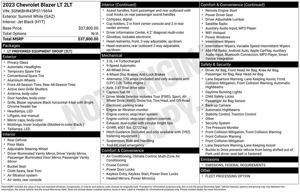 Gregg Young Ford is delighted to offer this good-looking 2023 Chevrolet Blazer LT in Summit White, AWD, 170 Amp Alternator, 3.47 Final Drive Axle Ratio, 4-Way Manual Front Passenger Seat Adjuster, 4-Wheel Disc Brakes, 6 Speakers, 6-Speaker Audio System Feature, 8-Way Power Driver Seat Adjuster, ABS brakes, Air Conditioning, Alloy wheels, AM/FM radio: SiriusXM with 360L, Apple CarPlay/Android Auto, Auto High-beam Headlights, Automatic temperature control, Brake assist, Bumpers: body-color, Child-Seat-Sensing Airbag, Compass, Delay-off headlights, Driver door bin, Driver vanity mirror, Dual front impact airbags, Dual front side impact airbags, Electronic Stability Control, Emergency communication system: OnStar and Chevrolet connected services capable, Four wheel independent suspension, Front anti-roll bar, Front Bucket Seats, Front Center Armrest, Front dual zone A/C, Front reading lights, Fully automatic headlights, Heated door mirrors, Illuminated entry, Knee airbag, Leather Shift Knob, Low tire pressure warning, Occupant sensing airbag, Outside temperature display, Overhead airbag, Overhead console, Panic alarm, Passenger door bin, Passenger vanity mirror, Power door mirrors, Power Driver Lumbar Control, Power driver seat, Power steering, Power windows, Preferred Equipment Group 2LT, Premium audio system: Chevrolet Infotainment 3 Plus, Premium Cloth Seat Trim, Radio data system, Radio: Chevrolet Infotainment 3 Plus System, Rear anti-roll bar, Rear reading lights, Rear seat center armrest, Rear window defroster, Rear window wiper, Remote keyless entry, Ride & Handling Suspension, Security system, SiriusXM w/360L, Speed control, Speed-sensing steering, Split folding rear seat, Spoiler, Steering wheel mounted audio controls, Tachometer, Telescoping steering wheel, Tilt steering wheel, Traction control, Trip computer, Variably intermittent wipers, Voltmeter.