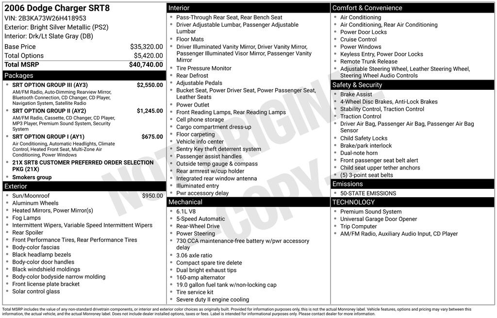 Gregg Young CDJR is excited to offer this charming 2006 Dodge Charger SRT8 in Bright Silver Metallic Clearcoat, TRADE IN, CLEAN CARFAX, 11-Speaker Kicker SRT High Performance Audio, 200 Watt Kicker SRT Subwoofer, 276 Watt Kicker SRT Amplifier, 6CD/Full Map GPS Display Navigation, Air Conditioning w/Dual Zone ATC, Air Filtering, Automatic Headlamps, Heated Front Seats, Illuminated entry, Navigation System w/GPS, Power Front Windows w/1-Touch Up & Down, Power Sunroof, Security Alarm, SIRIUS Satellite Radio, SRT Option Group I, SRT Option Group II, SRT Option Group III, Tilt steering wheel, UConnect Hands-Free Communication. SRT HEMI 6.1L V8 SMPI