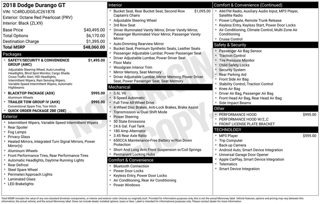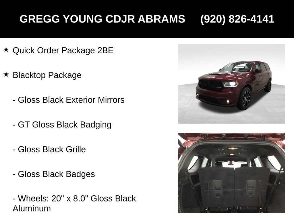 Gregg Young CDJR is very proud to offer this gorgeous 2018 Dodge Durango GT in Octane Red Pearlcoat, 1 USB Charging Port in Console, 12V Auxiliary Power Outlet In Console, 2nd Row Console w/Armrest & Storage, 3rd Row Floor Mat & Full Console, 7 & 4 Pin Wiring Harness, Apple CarPlay/Android Auto, Auto High Beam Headlamp Control, Automatic Headlamp Leveling System, Blacktop Package, Blind Spot & Cross Path Detection, Cargo Compartment Cover, Class IV Receiver Hitch, Gloss Black Badges, Gloss Black Exterior Mirrors, Gloss Black Grille, GT Gloss Black Badging, Heated front seats, Heavy-Duty Engine Cooling, Illuminated entry, Low-Beam High-Intensity Discharge Headlamps, ParkView Rear Back-Up Camera, Power Liftgate, Power Tilt & Telescopic Steering Column, Quick Order Package 2BE, Rain Sensitive Windshield Wipers, Rear Load Leveling Suspension, Remote keyless entry, Safety/Security & Convenience Group, Tilt steering wheel, Trailer Tow Group IV. 3.6L V6 24V VVT