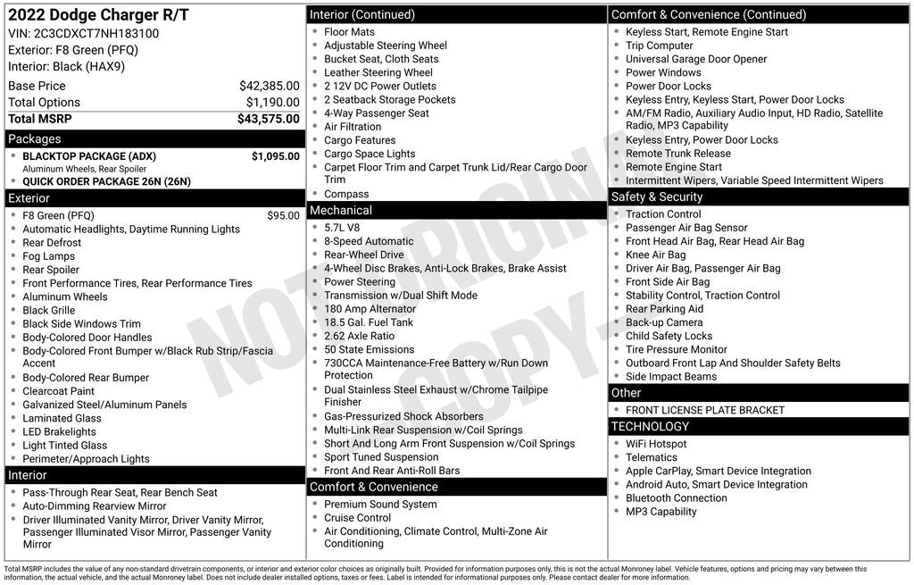 Gregg Young CDJR is pleased to offer this attractive 2022 Dodge Charger R/T in F8 Green, Apple CarPlay/Android Auto, Black 1-Piece Performance Spoiler, Black Dodge Grille Badge, Blacktop Package, Blacktop R/T Badge, Gloss Black I/P Cluster Trim Rings, HEMI Blacktop Fender Badge, Illuminated entry, ParkView Rear Back-Up Camera, Power driver seat, Power windows, Quick Order Package 26N, Radio: Uconnect 4C w/8.4" Display, Remote keyless entry, Satin Black Charger Decklid Badge, Satin Black Dodge Tail Lamp Badge, Tilt steering wheel. HEMI 5.7L V8 Multi Displacement VVT