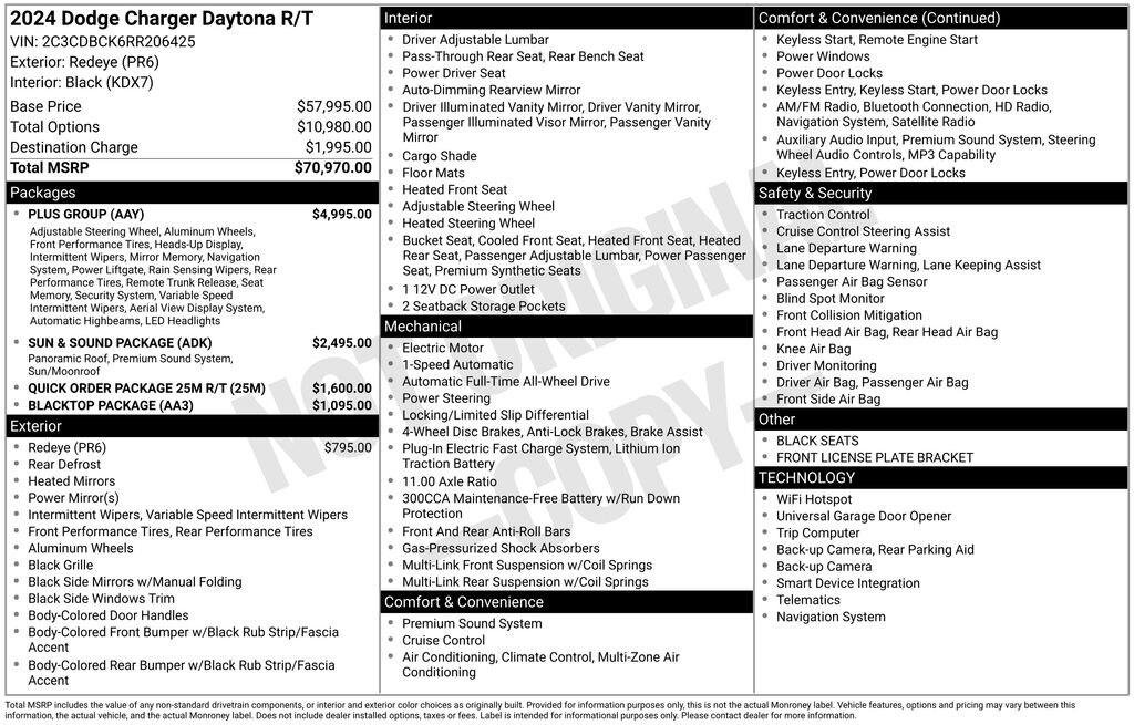Gregg Young CDJR is delighted to offer this good-looking 2024 Dodge Charger R/T in Redeye, Recent Arrival! 16" Color Driver Display, 18 High Performance Alpine Speakers w/Subwoofer, 2-Way Manual Adjust Head Restraints, 2-Way Power Driver Lumbar Adjust, 20" x 9" Aluminum Wheels, 8-Way Power Driver Seat Adjust, Ambient Light Color Control, Automatic High-Beam Headlamp Control, Black Color Multi-Function Mirrors, Blacktop Package, Bright Pedals, Dark Exterior Badging, Enhanced Security Alarm, Exterior Mirrors Logo Lamps, Exterior Mirrors w/Memory, Front Cubby Bin w/Light, Frunk, Full Glass Roof, Glove Box Lamp, Heads-Up Display, Heated Exterior Mirrors, Heated Front Seats, Heated Second Row Seats, Illuminated Door Pull Handles, Leatherette Seats, LED Footwell Lighting, LED Map Pockets, Low Back Bucket Seats, Map-In-Cluster Display, Nexen Brand Tires, ParkView Rear Back-Up Camera, Plus Group, Power 2-Way Passenger Lumbar Adjust, Power Adjust 8-Way Front Passenger Seat, Power Adjust Mirrors, Power Hatch, Power Tilt/Telescope Steering Column, Power Windows Global Down w/Key Fob, Premium Door Trim Panel, Premium Instrument Panel, Premium Interior Accents, Premium LED Low-High Reflective Headlamps, Quick Order Package 25M R/T, Radio, Driver Seat, Mirrors & Steering Column Memory, Rain Sensitive Windshield Wipers, Sun & Sound Package, Surround View Camera System, Ventilated Front Seats, Windshield Wiper De-Icer, Wireless Charging Pad. Electric Motor