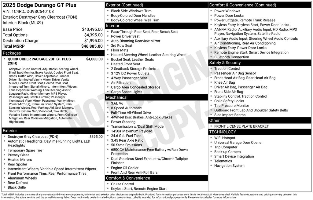 Gregg Young CDJR is honored to offer this great-looking 2025 Dodge Durango GT Plus in Destroyer Gray Clearcoat, ONE OWNER, 115V Auxiliary Power Outlet, 180 Amp Alternator, 506 Watt Amplifier, 7 & 4 Pin Wiring Harness, 9 Alpine Amplified Speakers w/Subwoofer, Adaptive Cruise Control w/Stop, Advanced Brake Assist, Auto High Beam Headlamp Control, Auto-Dimming Exterior Driver Mirror, Black Roof Rails, Blind Spot w/Trailer Detection, Bright Cargo Area Scuff Pads, Bright Front Door Sill Scuff Pads, Class IV Receiver Hitch, Dual Remote USB Port - Charge Only, Exterior Mirrors w/Heating Element, Exterior Mirrors w/Memory, Exterior Mirrors w/Supplemental Signals, Full Speed Forward Collision Warning Plus, Gloss Black Exterior Mirrors, Heated Second Row Seats, Heavy-Duty Engine Cooling, Integrated Roof Rail Crossbars, Lane Departure Warning Plus, Leather Trimmed Bucket Seats, Leather Wrapped Door Panels, LED Auxiliary Low Beam & Turn Signal, Navigation System, ParkSense Front/Rear Park Assist w/Stop, ParkView Rear Back-Up Camera, Power 6x9 Multi-Function Foldaway Mirrors, Power Driver/Passenger 4-Way Lumbar Adjust, Power Liftgate, Power Sunroof, Power Tilt & Telescopic Steering Column, Quick Order Package 2BH GT Plus, Radio: Uconnect 5 Nav w/10.1" Display, Radio/Driver Seat/Mirrors Memory, Rain Sensitive Windshield Wipers, Rear Load Leveling Suspension, Red Accent Stitching, Security Alarm, Sun Visors w/Illuminated Vanity Mirrors, Trailer Brake Control, Ventilated Front Seats, Wireless Charging Pad. 3.6L V6 24V VVT