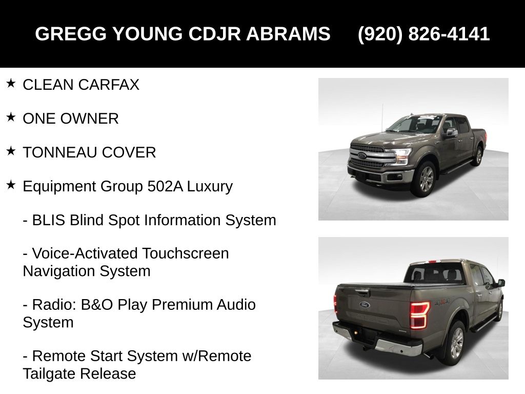 Gregg Young CDJR is delighted to offer this good-looking 2018 Ford F-150 Lariat in Stone Gray, Recent Arrival! CLEAN CARFAX, ONE OWNER, TONNEAU COVER, 110V/400W Outlet, 2nd Row Heated Seats, Active Park Assist, Automatic High Beam w/Rain-Sensing Wipers, BLIS Blind Spot Information System, Equipment Group 502A Luxury, Exterior Parking Camera Rear, GVWR: 6,600 lbs Payload Package, Heated front seats, Heated Steering Wheel, Illuminated entry, Lane-Keeping System, Lariat Chrome Appearance Package, Leather-Trimmed Bucket Seats, LED Sideview Mirror Spotlights, Power Glass Sideview Mirr w/Chrome Skull Caps, Power Tilt/Telescoping Steering Column w/Memory, Quad Beam LED Headlamps & LED Taillamps/Fog Lamps, Radio: B&O Play Premium Audio System, Remote keyless entry, Remote Start System w/Remote Tailgate Release, Reverse Sensing System, SYNC Connect, Technology Package, Tilt steering wheel, Twin Panel Moonroof, Universal Garage Door Opener, Ventilated front seats, Voice-Activated Touchscreen Navigation System, Windshield Wiper De-Icer. 2.7L V6 EcoBoost