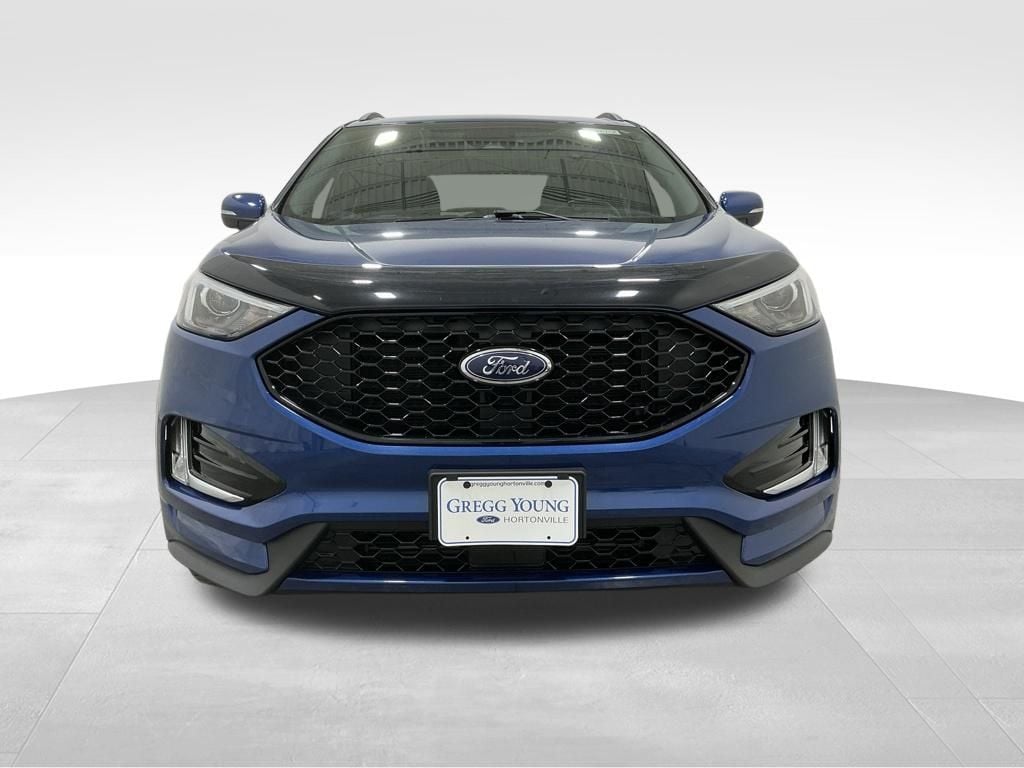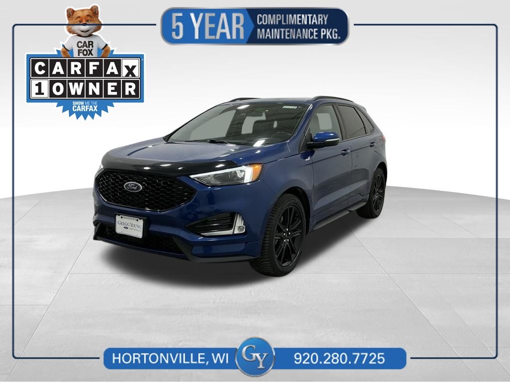 Gregg Young Ford is delighted to offer this attractive 2020 Ford Edge ST Line in Blue, AWD, 110V/150W AC Power Outlet, 3.80 Axle Ratio, 4-Wheel Disc Brakes, 9 Speakers, ABS brakes, ActiveX Seating Material Heated Bucket Seats, Adaptive Cruise Control w/Stop & Go, Air Conditioning, Alloy wheels, AM/FM radio: SiriusXM, Auto High-beam Headlights, Auto-dimming Rear-View mirror, Automatic temperature control, Brake assist, Bumpers: body-color, Cold Weather Package, Compass, Delay-off headlights, Driver door bin, Driver vanity mirror, Dual front impact airbags, Dual front side impact airbags, Electronic Stability Control, Emergency communication system: SYNC 3 911 Assist, Evasive Steering Assist, Foot-Activated Hands-Free Liftgate, Ford Co-Pilot360 Assist+, FordPass Connect, Four wheel independent suspension, Front & Rear Floor Liners, Front anti-roll bar, Front Bucket Seats, Front Center Armrest w/Storage, Front dual zone A/C, Front fog lights, Front reading lights, Fully automatic headlights, Heated door mirrors, Heated front seats, Heated Steering Wheel, Illuminated entry, Knee airbag, Lane Centering, Low tire pressure warning, Occupant sensing airbag, Outside temperature display, Overhead airbag, Overhead console, Panic alarm, Passenger door bin, Passenger vanity mirror, Perimeter Alarm, Power door mirrors, Power driver seat, Power passenger seat, Power steering, Power windows, Premium 9 Speaker Audio System, Radio: AM/FM Stereo/MP3 Capable, Rain sensing wipers, Rear anti-roll bar, Rear reading lights, Rear seat center armrest, Rear window defroster, Rear window wiper, Remote keyless entry, Remote Start System, Roof rack: rails only, SiriusXM Radio, SiriusXM Traffic & Travel Link, Speed control, Speed-Sensitive Wipers, Split folding rear seat, Spoiler, Steering wheel mounted audio controls, SYNC 3 Communications & Entertainment System, Tachometer, Telescoping steering wheel, Tilt steering wheel, Traction control, Trip computer, Turn signal indicator mirrors, Universal Garage Door Opener (UGDO), Variably intermittent wipers, Voice-Activated Touchscreen Navigation System, Windshield Wiper De-Icer, Wireless Charging Pad.
