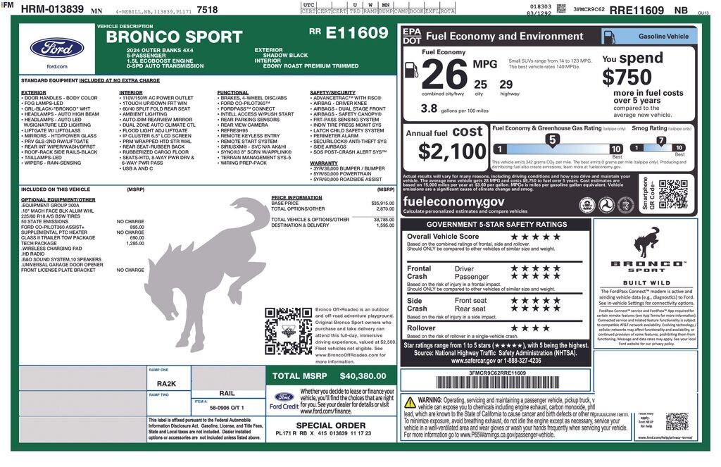 Gregg Young Ford is pleased to offer this fantastic-looking 2024 Ford Bronco Sport Outer Banks in Shadow Black, 3.80 Axle Ratio, 4-Wheel Disc Brakes, 6 Speakers, ABS brakes, Air Conditioning, Alloy wheels, AM/FM radio: SiriusXM, AM/FM Stereo, Auto High-beam Headlights, Auto-dimming Rear-View mirror, Automatic temperature control, Brake assist, Class II Trailer Tow Package w/Trailer Sway Control, Compass, Delay-off headlights, Driver door bin, Driver vanity mirror, Dual front impact airbags, Dual front side impact airbags, Electronic Stability Control, Emergency communication system: SYNC 3 911 Assist, Equipment Group 300A, Evasive Steering Assist, Ford Co-Pilot360 Assist+, Four wheel independent suspension, Front anti-roll bar, Front Bucket Seats, Front Center Armrest, Front dual zone A/C, Front fog lights, Front License Plate Bracket, Front reading lights, Fully automatic headlights, HD Radio, Heated door mirrors, Heated front seats, Heated steering wheel, Illuminated entry, Intelligent Adaptive Cruise Control w/Stop & Go, Knee airbag, Low tire pressure warning, Memory seat, Occupant sensing airbag, Outside temperature display, Overhead airbag, Overhead console, Panic alarm, Passenger door bin, Passenger vanity mirror, Power door mirrors, Power driver seat, Power passenger seat, Power steering, Power windows, Premium-Trimmed Heated Sport Contour Bucket Seats, Radio data system, Rain sensing wipers, Rear anti-roll bar, Rear Parking Sensors, Rear reading lights, Rear seat center armrest, Rear window defroster, Rear window wiper, Remote keyless entry, Security system, SiriusXM, Speed control, Speed-sensing steering, Speed-Sensitive Wipers, Split folding rear seat, Steering wheel mounted audio controls, SYNC 3 Communications & Entertainment System, Tachometer, Tech Package, Telescoping steering wheel, Tilt steering wheel, Traction control, Trip computer, Universal Garage Door Opener (UGDO), Variably intermittent wipers, Voice-Activated Touchscreen Navigation System, Wheels: 18" Ebony Black-Painted Aluminum, Wireless Charging Pad.