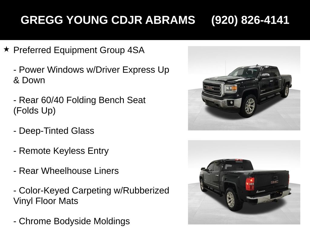 Gregg Young CDJR is pleased to offer this great-looking 2015 GMC Sierra 1500 SLT in Onyx Black, 110-Volt AC Power Outlet, 150 Amp Alternator, 4.2" Diagonal Color Display Driver Info Center, 6" Rectangular Chromed Tubular Assist Steps, Auto-Dimming Inside Rear-View Mirror, Auxiliary External Transmission Oil Cooler, Chrome Bodyside Moldings, Chrome Door Handles, Chrome Grille Surround, Chrome Mirror Caps, Color-Keyed Carpeting w/Rubberized Vinyl Floor Mats, Deep-Tinted Glass, Driver & Front Passenger Illuminated Vanity Mirrors, Dual-Zone Automatic Climate Control, Electric Rear-Window Defogger, Electronic Autotrac Transfer Case, EZ Lift & Lower Tailgate, Front Frame-Mounted Black Recovery Hooks, Front Halogen Fog Lamps, Heated Driver & Front Passenger Seats, Heavy-Duty Rear Locking Differential, Hill Descent Control, Leather Wrapped Heated Steering Wheel, Leather Wrapped Steering Wheel w/Cruise Controls, LED Cargo Box Lighting, Manual Tilt Wheel Steering Column, Off-Road Suspension Package, OnStar 6 Months Directions & Connections Plan, OnStar w/4G LTE, Power Adjustable Pedals, Power Folding & Adjustable Heated Outside Mirrors, Power Sliding Rear Window, Power Sunroof, Power Windows w/Driver Express Up & Down, Preferred Equipment Group 4SA, Rear 60/40 Folding Bench Seat (Folds Up), Rear Vision Camera w/Dynamic Guide Lines, Rear Wheelhouse Liners, Remote Keyless Entry, Remote Vehicle Starter System, Single Slot CD/MP3 Player, SLT Crew Cab Value Package, SLT Preferred Package, Steering Wheel Audio Controls, Theft Deterrent System (Unauthorized Entry), Trailering Equipment, Universal Home Remote. EcoTec3 5.3L V8