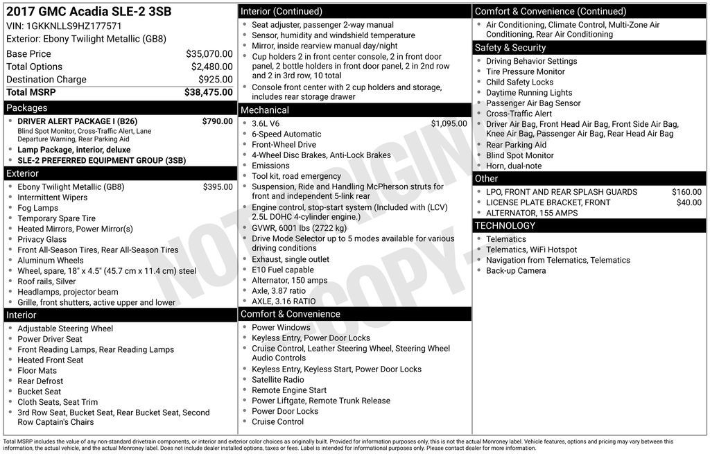 Gregg Young CDJR is honored to offer this good-looking 2017 GMC Acadia SLE-2 in Ebony Twilight Metallic, Recent Arrival! CLEAN CARFAX, ONE OWNER, Apple CarPlay/Android Auto, Driver Alert Package I, Exterior Parking Camera Rear, Heated front seats, Power driver seat, Power Liftgate, Preferred Equipment Group 3SB, Rear Cross-Traffic Alert, Rear Park Assist, Remote keyless entry, Roof rack: rails only, Side Blind Zone Alert w/Lane Change Alert. 3.6L V6 SIDI DOHC VVT