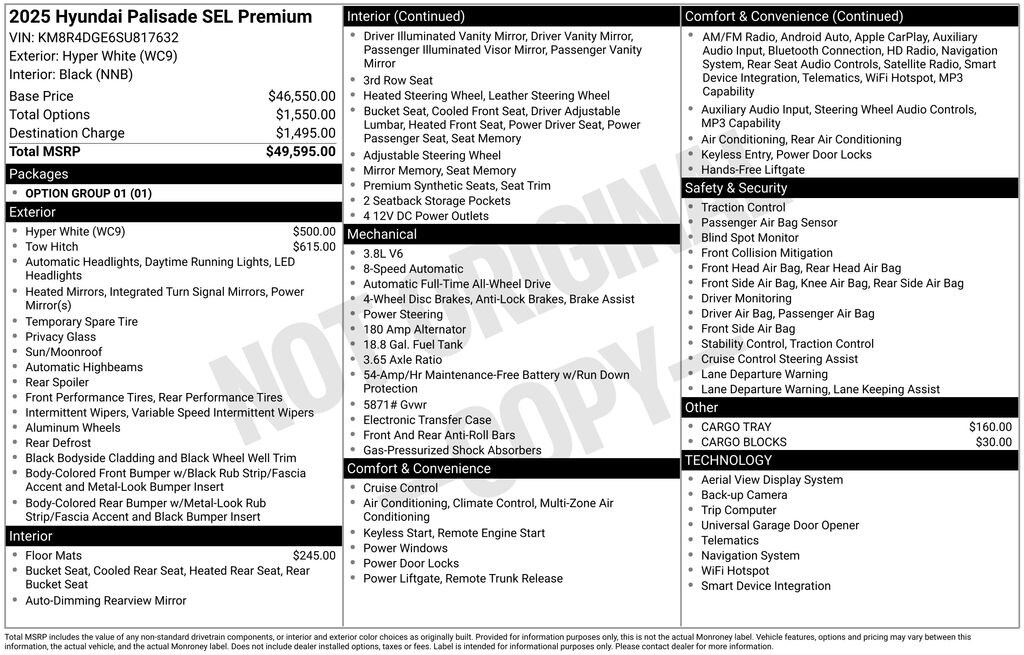 Gregg Young CDJR is very proud to offer this outstanding 2025 Hyundai Palisade SEL Premium in Hyper White, Recent Arrival! CLEAN CARFAX, ONE OWNER, Apple CarPlay & Android Auto, Exterior Parking Camera Rear, Heated front seats, Heated rear seats, Heated steering wheel, Illuminated entry, Navigation System, Option Group 01, Power driver seat, Power Liftgate, Power moonroof, Remote keyless entry, Tilt steering wheel, Ventilated rear seats. V6
