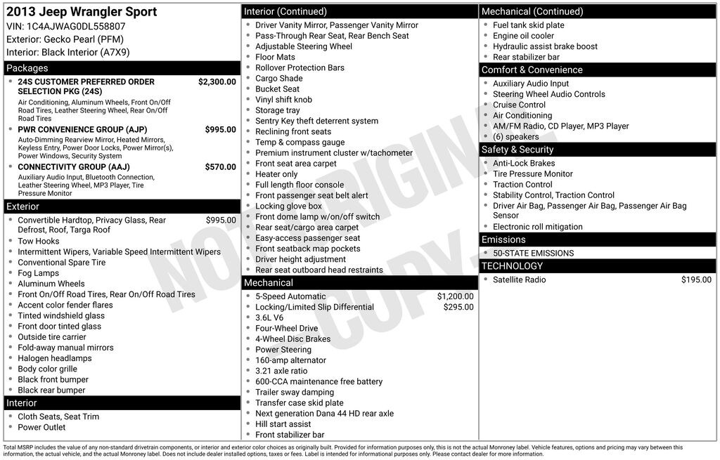 Gregg Young CDJR is very proud to offer this beautiful 2013 Jeep Wrangler Sport in Gecko Pearlcoat, TRADE IN, CLEAN CARFAX, Air Conditioning, Auto-Dimming Mirror w/Reading Lamp, Connectivity Group, Front 1-Touch Down Power Windows, Leather Wrapped Steering Wheel, Power Convenience Group, Power Heated Mirrors, Power Locks, Quick Order Package 24S, Remote Keyless Entry, Remote USB Port, Security Alarm, Tire Pressure Monitoring Display, Uconnect Voice Command w/Bluetooth, Vehicle Information Center. 3.6L V6 24V VVT
