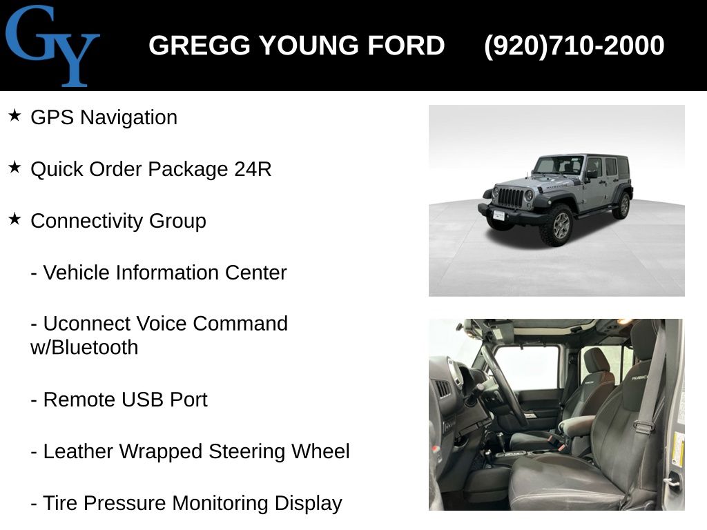 Gregg Young Ford is excited to offer this great-looking and fun 2016 Jeep Wrangler Unlimited Rubicon in Billet Silver Metallic Clearcoat, 17" x 7.5" Polished Mineral Gray Wheels, 3.73 Rear Axle Ratio, 4-Wheel Disc Brakes, 40GB Hard Drive w/28GB Available, 5-Year SiriusXM Travel Link Service, 6.5" Touchscreen Display, 8 Speakers, ABS brakes, Air Conditioning, Alloy wheels, Alpine 9-Speaker w/All Weather Subwoofer, AM/FM radio: SiriusXM, Audio Jack Input for Mobile Devices, Auto-dimming Rear-View mirror, Black 3-Piece Hard Top, Brake assist, CD player, Cloth Seats w/Adjustable Head Restraints, Compass, Connectivity Group, Delete Sunrider Soft Top, Driver door bin, Driver vanity mirror, Dual front impact airbags, Electronic Stability Control, Freedom Panel Storage Bag, Front anti-roll bar, Front Bucket Seats, Front Center Armrest w/Storage, Front fog lights, Front reading lights, Fully automatic headlights, GPS Navigation, Heated door mirrors, Illuminated entry, Integrated roll-over protection, Leather steering wheel, Leather Wrapped Steering Wheel, Low tire pressure warning, Manufacturer's Statement of Origin, Occupant sensing airbag, Outside temperature display, Panic alarm, Passenger door bin, Passenger vanity mirror, Performance Suspension, Power door mirrors, Power steering, Power windows, Quick Order Package 24R, Radio data system, Radio: 130, Radio: 430N, Rear anti-roll bar, Rear Window Defroster, Rear Window Wiper/Washer, Remote keyless entry, Remote Start System, Remote USB Port, Security system, SiriusXM Travel Link, Speed control, Split folding rear seat, Steering wheel mounted audio controls, Sunrider Soft Top, Tachometer, Tilt steering wheel, Tire Pressure Monitoring Display, Traction control, Trip computer, Uconnect Voice Command w/Bluetooth, Variably intermittent wipers, Vehicle Information Center.