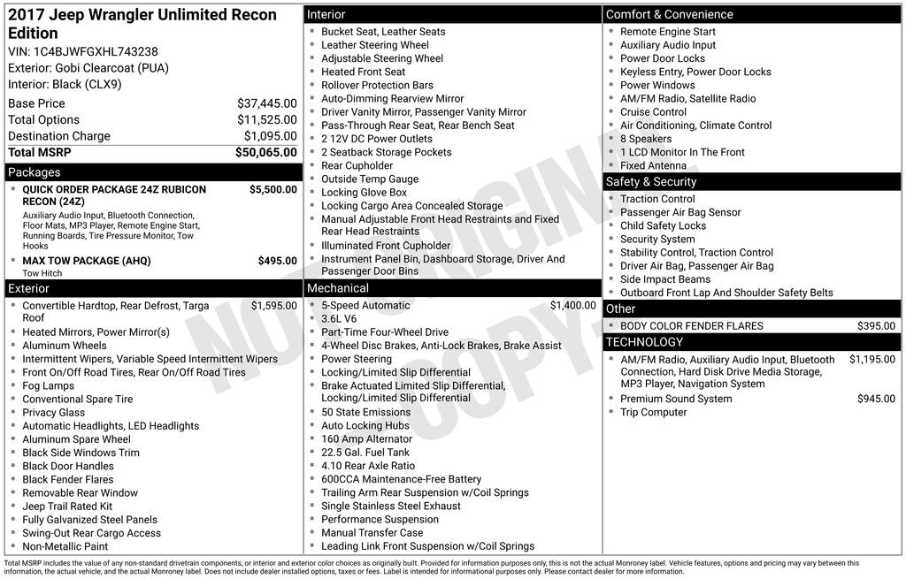 Gregg Young CDJR is very proud to offer this outstanding 2017 Jeep Wrangler Unlimited Rubicon Recon in Gobi Clearcoat, Recent Arrival! CLEAN CARFAX, 40GB Hard Drive w/28GB Available, 5-Year SiriusXM Travel Link Service, 6.5" Touchscreen Display, Accent Stitching, Air Conditioning w/Auto Temperature Control, Audio Jack Input for Mobile Devices, Black Fuel Filler Door, Class II Receiver Hitch, Connectivity Group, Dana 44/226MM Rear Axle, Dana M44/216MM Front Axle, GPS Navigation, HD Rock Rails w/Step Pad, Heated Front Seats, Hood w/Power Dome, Jeep Trail Rated Kit, Logloss Granite Crystal Jeep Badge, Low Gloss Black Wrangler Decal, Max Tow Package, Midnight Star Interior Accents, MOPAR Black Tail Lamp Guards, MOPAR Coat Hooks & Grab Handles, MOPAR Slush Mats w/Red Accents, Premium Black Sunrider Soft Top, Premium EVIC Message Center, Quick Order Package 24Z Rubicon Recon, R1234YF A/C Refrigerant, Radio: 430 Nav, Recon Badge, Recon Decals, Recon Grille, Recon Leather Seats, Recon Package, Red Front & Rear Tow Hooks, Red Seat Belts, Red Switches, Red Trail Rated Badge, Remote keyless entry, Remote Start System, Remote USB Port, SiriusXM Travel Link, Steel Front Bumper, Steel Rear Bumper, Trailer Tow w/4-Pin Connector Wiring, Wheels: 17" x 7.5" Granite Crystal Aluminum. 3.6L V6 24V VVT