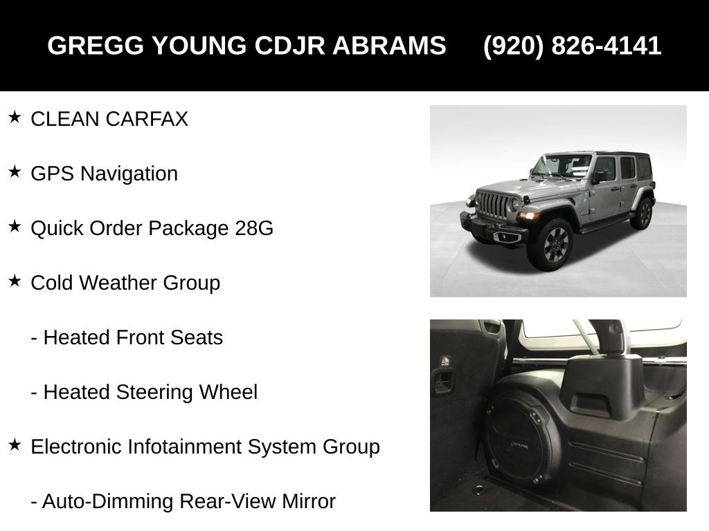 Gregg Young CDJR is delighted to offer this attractive 2018 Jeep Wrangler Unlimited Sahara in Billet Silver Metallic Clearcoat, CLEAN CARFAX, 1-Year SiriusXM Guardian Trial, 5-Year SiriusXM Traffic Service, 5-Year SiriusXM Travel Link Service, 8.4" Touchscreen Display, Alpine Premium Audio System, Auto-Dimming Rear-View Mirror, Cold Weather Group, Electronic Infotainment System Group, GPS Navigation, HD Radio, Heated Front Seats, Heated Steering Wheel, ParkView Rear Back-Up Camera, Quick Order Package 28G, Radio: Uconnect 4C Nav w/8.4" Display, Roadside Assistance & 9-1-1 Call, SiriusXM Traffic Plus, SiriusXM Travel Link. 2.0L I4 DOHC