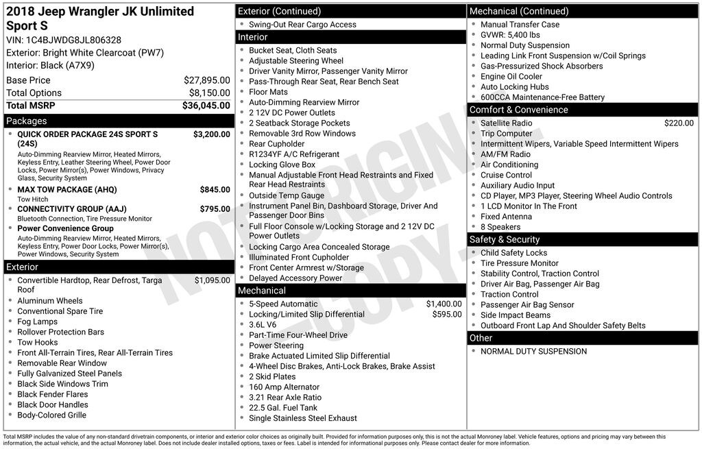 Gregg Young CDJR is pumped up to offer this gorgeous-looking 2018 Jeep Wrangler JK Unlimited Sport in Bright White Clearcoat, CLEAN CARFAX, ONE OWNER, Auto-Dimming Mirror w/Reading Lamp, Chrome/Leather Wrapped Shift Knob, Class II Receiver Hitch, Connectivity Group, Deep Tint Sunscreen Windows, Front 1-Touch Down Power Windows, Leather Wrapped Steering Wheel, Max Tow Package, Power Convenience Group, Power Heated Mirrors, Power Locks, Quick Order Package 24S Sport S, Remote Keyless Entry, Security Alarm, Tire Pressure Monitoring Display, Trailer Tow w/4-Pin Connector Wiring, Uconnect Voice Command w/Bluetooth, Vehicle Information Center. 3.6L V6 24V VVT