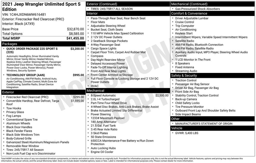 Gregg Young CDJR is delighted to offer this gorgeous 2021 Jeep Wrangler Unlimited Sport S in Firecracker Red Clearcoat, CLEAN CARFAX, 7.0" Touchscreen Display, Air Conditioning w/Auto Temperature Control, Air Filtering, Apple CarPlay, Automatic Headlamps, Cluster 7.0" TFT Color Display, Deep Tint Sunscreen Windows, Front 1-Touch Down Power Windows, Google Android Auto, GPS Antenna Input, Integrated Center Stack Radio, Leather Wrapped Steering Wheel, ParkView Rear Back-Up Camera, Power Heated Mirrors, Quick Order Package 22S Sport S, Radio: Uconnect 4 w/7" Display, Remote Keyless Entry, Security Alarm, SiriusXM Satellite Radio, Speed Sensitive Power Locks, Sport S, Sun Visors w/Illuminated Vanity Mirrors, Technology Group, Tilt steering wheel, USB Host Flip. 2.0L I4 DOHC
