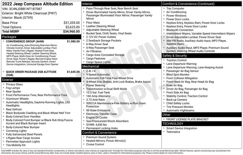 Gregg Young CDJR is delighted to offer this superb 2022 Jeep Compass Altitude in Bright White Clearcoat, CLEAN CARFAX, ONE OWNER, 115V Auxiliary Power Outlet, 2nd Row USB Type A/C Charge Only, Air Conditioning ATC w/Dual Zone Control, All-Season Floor Mats, Altitude Special Edition, Auto-Dimming Rear-View Mirror, Black Day Light Opening Moldings, Black Headliner, Black Roof, Bright Exhaust Tip, Convenience Group, Foot Activated Open 'N Go Liftgate, Gloss Black Badges, Gloss Black Grille & Crosshairs, Gloss Black Lower Rear Fascia Valance, Heated Front Seats, Heated Steering Wheel, Humidity Sensor, Leather Wrapped Steering Wheel, Light Tungsten Interior Accent Stitching, ParkView Rear Back-Up Camera, Piano Black Interior Accents, Power Adjust 8-Way Driver Seat, Power Liftgate, Quick Order Package 2GB Altitude, Radio: Uconnect 5 w/10.1" Display, Remote keyless entry, Remote Start System, Reversible Carpet/Vinyl Cargo Mat, Security Alarm, Universal Garage Door Opener, Vehicle Information Center, Windshield Wiper De-Icer. 2.4L I4