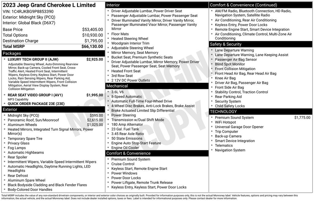 Gregg Young CDJR is very proud to offer this outstanding 2023 Jeep Grand Cherokee L Limited in Midnight Sky, Recent Arrival! 2nd Row Manual Window Shades, Amazon Fire TV Built-In, Auto-Dimming Exterior Driver Mirror, Capri Leatherette w/Axis II Seats, Heated front seats, Integrated Off-Road Camera, Intersection Collision Assist System, Luxury Tech Group II, Memory Steering Column, Navigation System, ParkSense Front/Rear Park Assist w/Stop, ParkView Rear Back-Up Camera, Passive Entry - Front/Rear Doors, Liftgate, Power driver seat, Power Tilt/Telescope Steering Column, Quick Order Package 23E, Radio: Uconnect 5 Nav w/10.1" Display, Rain Sensitive Windshield Wipers, Rear Back Up Camera Washer, Rear Seat Video Group I, Rearview Autodim Digital Display Mirror, Remote keyless entry, Seatback Video Screens, Surround View Camera System, Tilt steering wheel, Ventilated Front Seats, Video USB Port, Wireless Charging Pad. 3.6L V6 24V VVT