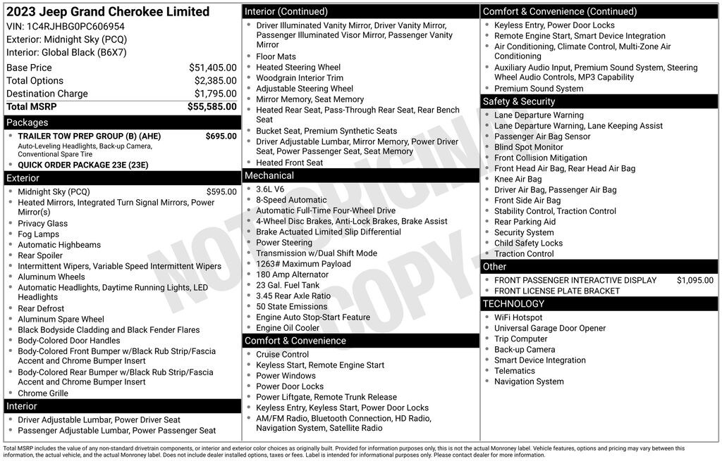 Gregg Young CDJR is excited to offer this handsome 2023 Jeep Grand Cherokee Limited in Midnight Sky, Recent Arrival! TRADE IN, CLEAN CARFAX, ONE OWNER, 220 Amp Alternator, Automatic Headlamp Levelling System, Heated front seats, Heated rear seats, Heated steering wheel, Heavy-Duty Engine Cooling, Illuminated entry, Navigation System, ParkView Rear Back-Up Camera, Power driver seat, Power Liftgate, Quick Order Package 23E, Radio: Uconnect 5 Nav w/10.1" Display, Rear Load Levelling Suspension, Remote keyless entry, Tilt steering wheel, Trailer Hitch Zoom, Trailer Tow Prep Group (B) (DISC). 3.6L V6 24V VVT