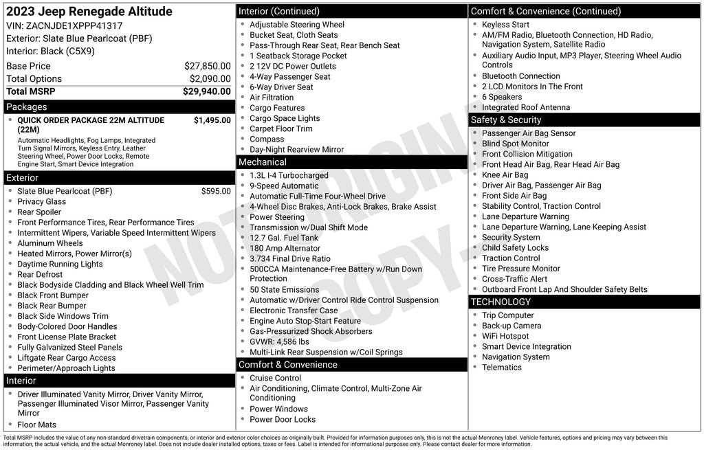 Gregg Young CDJR is pumped up to offer this attractive 2023 Jeep Renegade Altitude in Slate Blue Pearlcoat, CLEAN CARFAX, ONE OWNER, Altitude Package, Ambient LED Interior Lighting, Apple CarPlay/Android Auto, Automatic Headlamps, Black Side Roof Rails, Cluster 7" TFT Color Display, Cornering Front Fog Lamps, Deluxe Cloth High-Back Bucket Seats, Exterior Mirrors w/Supplemental Signals, Gloss Black Exterior Accents, Gloss Black Grille-Gloss Black Xhairs, Illuminated entry, Keyless Entry w/Panic Alarm, Navigation System, ParkView Rear Back-Up Camera, Premium-Wrapped Steering Wheel, Quick Order Package 22M Altitude, Radio: Uconnect 4C Nav w/8.4" Display, Remote keyless entry, Remote Start System, Roof rack: rails only, Tilt steering wheel, Upgraded Exterior Color Mirror. 1.3L I4