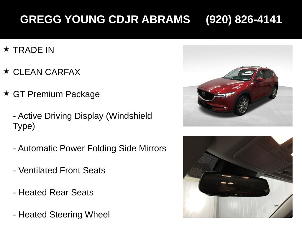 Gregg Young CDJR is excited to offer this superb 2021 Mazda CX-5 Grand Touring in Soul Red Crystal Metallic, Recent Arrival! TRADE IN, CLEAN CARFAX, Active Driving Display (Windshield Type), Automatic Power Folding Side Mirrors, Exterior Parking Camera Rear, GT Premium Package, Heated front seats, Heated Rear Seats, Heated Steering Wheel, Power driver seat, Power Liftgate, Power moonroof, Remote keyless entry, Tilt steering wheel, Ventilated Front Seats, Windshield Wiper De-Icer. SKYACTIV® 2.5L 4-Cylinder DOHC 16V