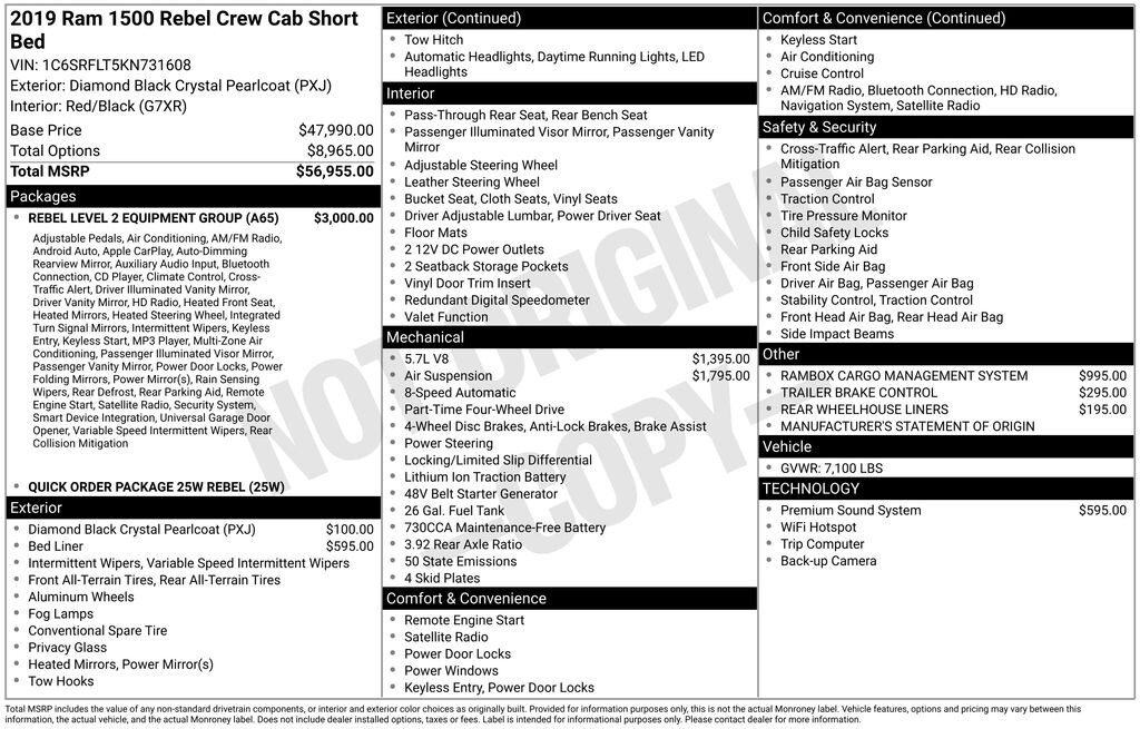 Gregg Young CDJR is delighted to offer this stunning 2019 Ram 1500 Rebel in Diamond Black Crystal Pearlcoat, Recent Arrival! 115V Auxiliary Rear Power Outlet, 2 USB Full Function/Charge Only Media Hub, 8.4" Touchscreen Display, Air Conditioning ATC w/Dual Zone Control, Apple CarPlay, Auto-Dimming Exterior Driver Mirror, Auto-Dimming Rear-View Mirror, Body Color Door Handles, Exterior Mirrors Courtesy Lamps, Exterior Mirrors w/Supplemental Signals, Foam Bottle Insert (Door Trim Panel), Google Android Auto, Heated Front Seats, Heated Steering Wheel, Integrated Center Stack Radio, ParkSense Front/Rear Park Assist w/Stop, ParkView Rear Back-Up Camera, Power Adjustable Pedals, Power driver seat, Power Heated Fold Away Mirrors, Power-Folding Mirrors, Quick Order Package 25W Rebel, Radio: Uconnect 12 w/Navigation (DISC), Rain Sensitive Windshield Wipers, Rear Dome w/On/Off Switch Lamp, Rear Underseat Compartment Storage, Rear Window Defroster, Rebel Level 2 Equipment Group, Remote keyless entry, Remote Proximity Keyless Entry, Remote Start System, Security Alarm, Single Disc Remote CD Player, Sun Visors w/Illuminated Vanity Mirrors, Tilt steering wheel, Universal Garage Door Opener. HEMI 5.7L V8 Multi Displacement VVT