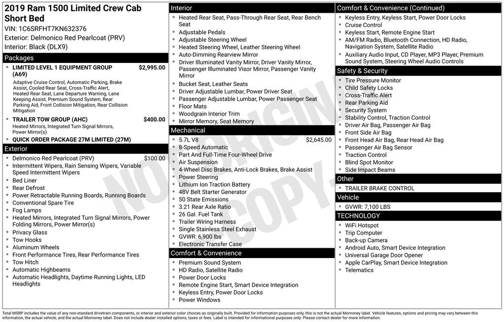 Gregg Young CDJR is proud to offer this good-looking 2019 Ram 1500 Limited in Delmonico Red Pearlcoat, CLEAN CARFAX, ONE OWNER, 1-Yr SiriusXM Guardian Trial, 12" Touchscreen Display, Adaptive Cruise Control w/Stop & Go, Advanced Brake Assist, Apple CarPlay, Apple CarPlay/Android Auto, Disassociated Touchscreen Display, Full Speed Forward Collision Warning Plus, Google Android Auto, GPS Antenna Input, GPS Navigation, harman/kardon 19 Speaker Premium Sound, HD Radio, Heated front seats, Heated rear seats, Integrated Center Stack Radio, Lane Keep Assist, Limited Level 1 Equipment Group, No Satellite Coverage w/HI/AK/PR/VI/GU, Parallel & Perp Park Assist w/Stop, ParkView Rear Back-Up Camera, Power Chrome Trailer Tow Mirrors, Power driver seat, Quick Order Package 27M Limited, Radio: Uconnect 12 w/Navigation, Remote keyless entry, SiriusXM Satellite Radio, SiriusXM Traffic Plus, SiriusXM Travel Link, SiriusXM w/360L, Tilt steering wheel, Trailer Brake Control, Trailer Tow Group, Trailer Tow Mirrors, USB Host Flip, Ventilated Rear Seats. HEMI 5.7L V8 Multi Displacement VVT