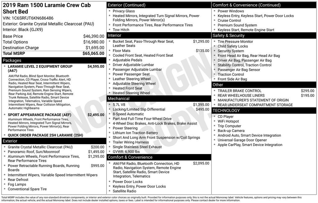 Gregg Young CDJR is pleased to offer this great 2019 Ram 1500 Laramie in Granite Crystal Metallic Clearcoat, Recent Arrival! TRADE IN, 8.4" Touchscreen Display, Auto High Beam Headlamp Control, Black Interior Accents, Blind Spot & Cross Path Detection, Body Color Door Handles, Body Color Front Bumper, Body Color Rear Bumper w/Step Pads, Dome Dual LED Reading Lamp, Dual-Pane Panoramic Sunroof, Foam Bottle Insert (Door Trim Panel), GPS Navigation, Grille B/Color Outline 3 Texture 4, harman/kardon 19 Speaker Premium Sound, Heated front seats, Heated Second Row Seats, Heated Steering Wheel, Illuminated entry, Laramie Level 2 Equipment Group, Leather Trimmed Bucket Seats, LED Dome/Reading Lamp, ParkSense Front/Rear Park Assist w/Stop, ParkView Rear Back-Up Camera, Power driver seat, Power Heated Fold-Away Mirrors, Quick Order Package 25H Laramie, Radio: Uconnect 4C Nav w/8.4" Display, Rain Sensitive Windshield Wipers, Rear 60/40 Folding Split Recline Seat, Rear Underseat Compartment Storage, Remote keyless entry, Remote Tailgate Release, Single Disc Remote CD Player, Sport Appearance Package, Sport Performance Hood, Tailgate Ajar Warning Lamp, Ventilated front seats, Wireless Charging Pad. HEMI 5.7L V8 Multi Displacement VVT