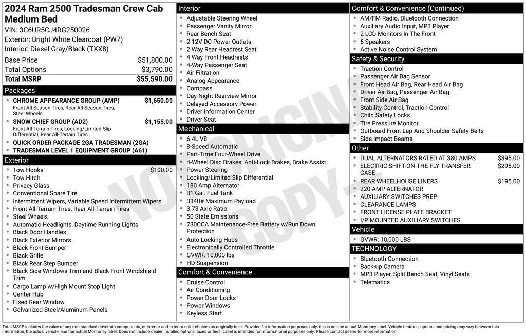 Gregg Young CDJR is pleased to offer this stunning 2024 Ram 2500 Tradesman in Bright White Clearcoat, CLEAN CARFAX, ONE OWNER, Anti-Spin Differential Rear Axle, Auxiliary Switches Prep, Bright Front Bumper, Bright Rear Bumper, Chrome Appearance Group, Chrome Grille Surround, Chrome Headlamp Bezels, Clearance Lamps, I/P Mounted Auxiliary Switches, Illuminated entry, Manual Folding Exterior Mirrors, Manual Telescoping Mirrors, Matte Black Mesh Grille w/Chrome, ParkView Rear Back-Up Camera, Quick Order Package 2GA Tradesman, Radio: Uconnect 3 w/5" Display, Snow Chief Group, Tradesman Level 1 Equipment Group. 6.4L V8